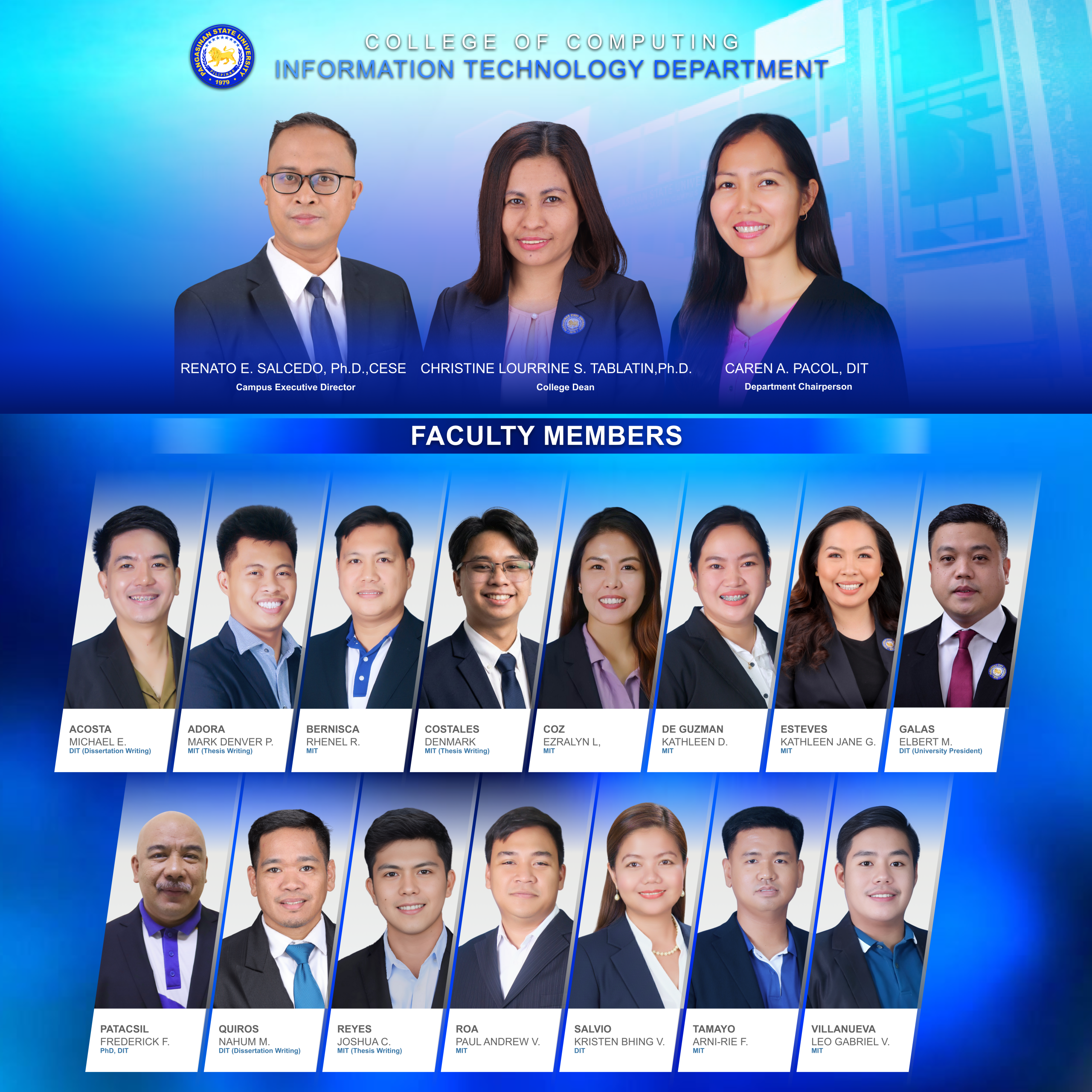 Today, the IT Department is more committed than ever to providing relevant, responsive, and future-ready education. It continues to uphold its mission of shaping competent IT professionals who entrust their future to Pangasinan State University.