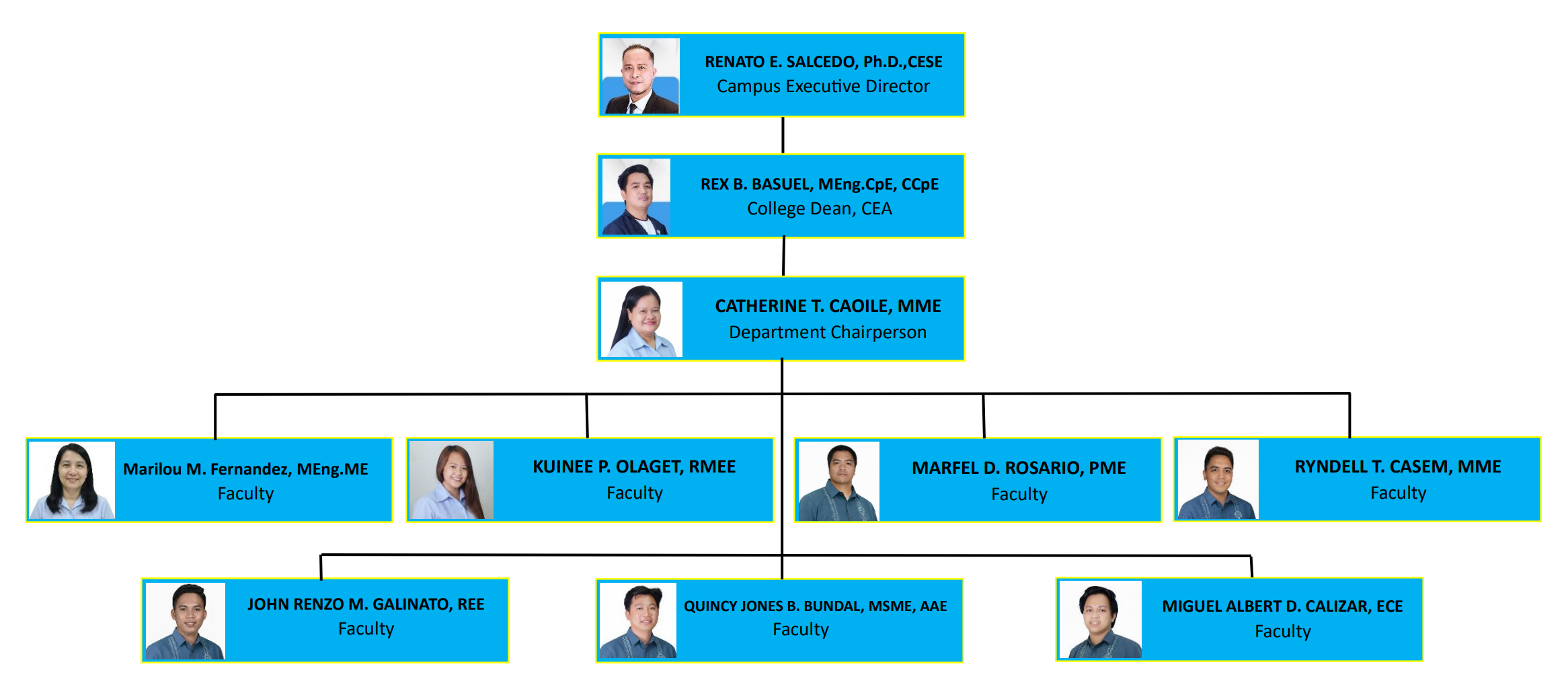 Behind the success of the ME Department is the concerted effort of its well-seasoned educators whose teaching skills are perfected by time and experience, along with up-to-date knowledge of mechanical engineering. To date, the faculty of the department is composed of young but promising, licensed mechanical engineers headed by a hardworking Department Chairperson and versatile along with the Dean of the College of Engineering and Architecture.