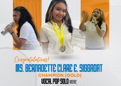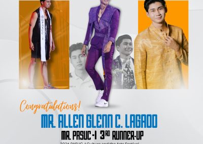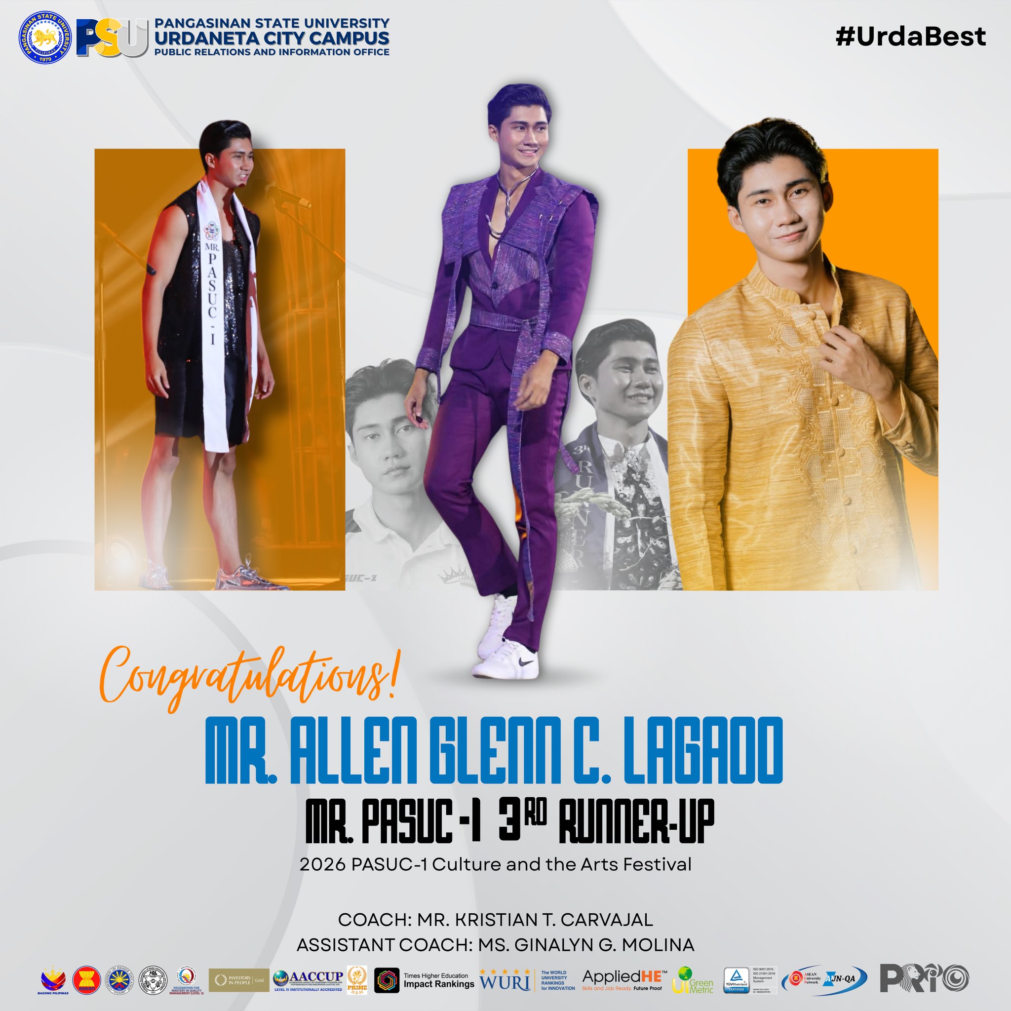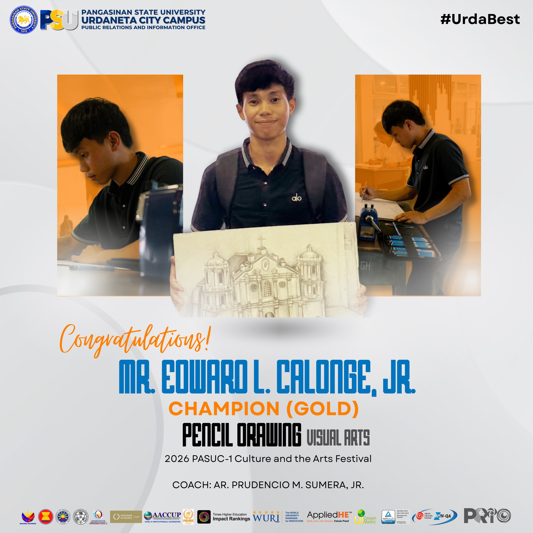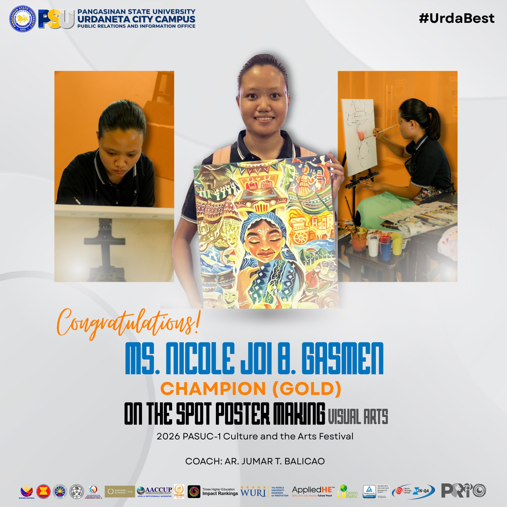 Pangasinan State University–Urdaneta City Campus earned notable recognition at the 2026 PASUC-1 Culture and the Arts Festival, as its student-artists secured top awards in music, visual arts, and cultural competitions. The campus proudly celebrates Ms. Bernadette Clare E. Siggadat, Champion (Gold) in Vocal Pop Solo; Mr. Edward L. Calonge, Jr., Champion (Gold) in Pencil Rendering; Ms. Nicole Joi B. Gasmen, Champion (Gold) in Poster Making; and Mr. Allen Glenn C. Lagado, Mr. PASUC-1 3rd Runner-Up —showcasing excellence, creativity, and competitive spirit on the regional stage.